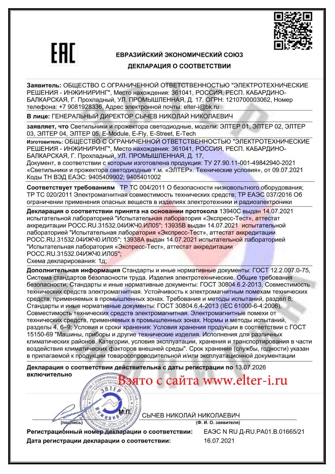 Светильник светодиодный серии ЭЛТЕР 01 (по ТУ 27.90.11-001-49842940-2021)